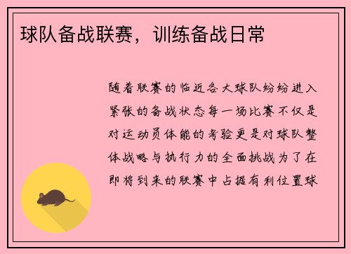 随着联赛的临近,各大球队纷纷进入紧张的备战状态。每一场比赛不仅是对运动员体能的考验,更是对球队整体战略与执行力的全面挑战。为了在即将到来的联赛中占据有利位置,球队的备战工作早已开始,并且安排得井井有条...