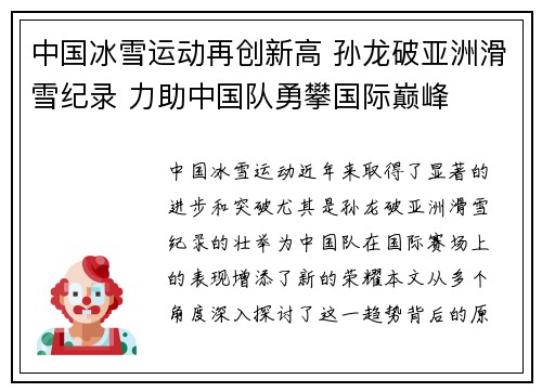 中国冰雪运动近年来取得了显著的进步和突破,尤其是孙龙破亚洲滑雪纪录的壮举,为中国队在国际赛场上的表现增添了新的荣耀。本文从多个角度深入探讨了这一趋势背后的原因和影响。1、中国冰雪运动的崛起近年来,中国...