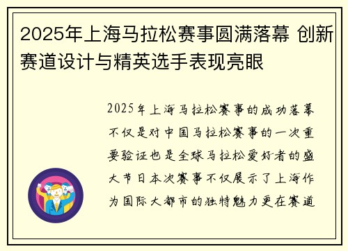 2025年上海马拉松赛事的成功落幕,不仅是对中国马拉松赛事的一次重要验证,也是全球马拉松爱好者的盛大节日。本次赛事不仅展示了上海作为国际大都市的独特魅力,更在赛道设计和精英选手的表现上呈现出众的亮点。...