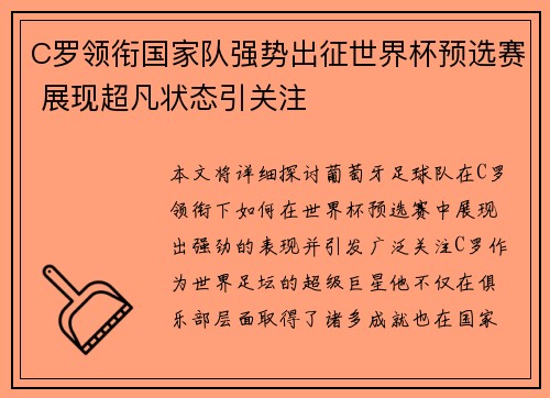 本文将详细探讨葡萄牙足球队在C罗领衔下,如何在世界杯预选赛中展现出强劲的表现并引发广泛关注。C罗作为世界足坛的超级巨星,他不仅在俱乐部层面取得了诸多成就,也在国家队中扮演着至关重要的角色。随着世界杯预...