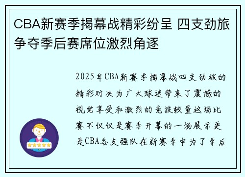 2025年CBA新赛季揭幕战,四支劲旅的精彩对决为广大球迷带来了震撼的视觉享受和激烈的竞技较量。这场比赛不仅仅是赛季开幕的一场展示,更是CBA各支强队在新赛季中为了季后赛席位展开的殊死拼搏。北京首钢、...