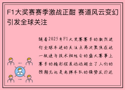 随着2025年F1大奖赛赛季的激烈进行,全球车迷的关注点再次聚焦在这一极速与技术相结合的盛大赛事上。赛季的精彩程度远远超出了人们的预期,无论是老牌车队的强势反扑,还是新兴车队的挑战,F1赛道上风云变幻...