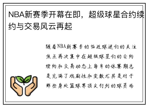 随着NBA新赛季的临近,球迷们的关注焦点再次集中在超级球星们的合约续约和交易动态上。每年的休赛期总是充满了戏剧性和变数,尤其是对于那些身处篮球界顶尖行列的球员而言,他们的动向不仅关乎球队的未来,还直接...